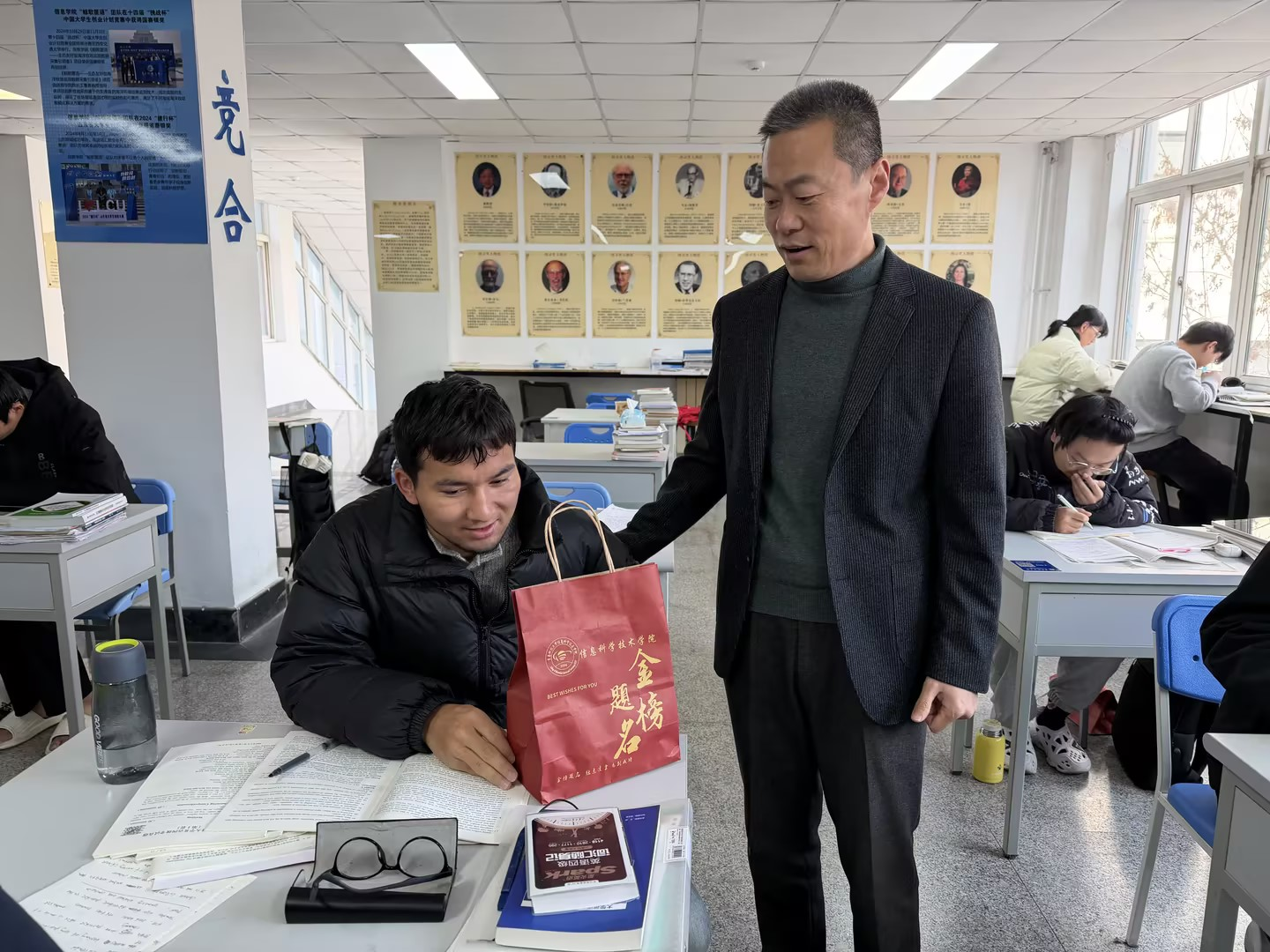 收到“加油包”的小李同学惊喜不已,“这段时间压力挺大的,看到老师们专程来送祝福,感觉心里特别暖,备考的动力更足了!”小王同学拿起“柿柿”如意挂件说:“没想到能在这个时候收到学院独一无二的关怀,啥也不说了,我回去复习了!”
